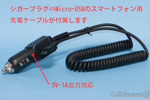付属する車載用充電器は、シガープラグ⇔Micro-USBタイプです。