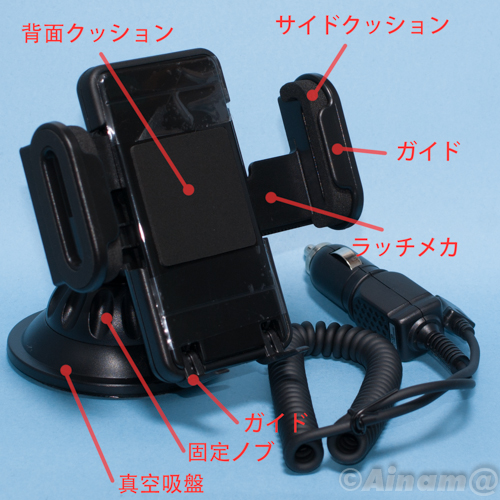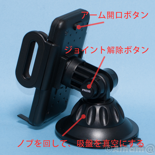 この車載ホルダーは、粘着性の真空吸盤でダッシュボード等に固定しますが、吸盤の台座にあるノブを回す事により吸盤が引っ張られて真空状態になります。※本当の真空にはなりません
