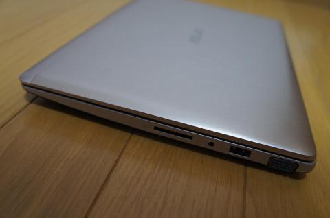 色はシャンパンゴールドということですが、限りなくシルバーに近いです。左側面は、LANポート、HDMI、USB3.0、USB2.0です。最近のことですから、USB3.0が付いてるのはありがたい。いただけないのが、LANが100BASEということ。この手のパソコンで有線接続することは、滅多とないのでいいでしょう。
