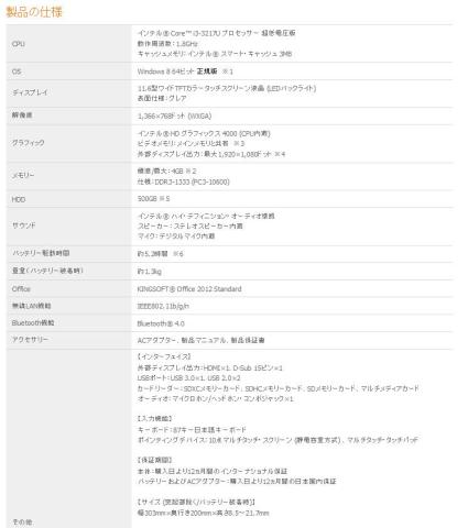 タッチパネル、Windows8、i3、4GBメモリ、500GBのHDDでこの値段。タッチパネルモバイルノートだと鉄板だと思います。しかし、動作はというと、メモリの増設ができないということで、若干モッサリとしています。なので、SSD化をおすすめします。