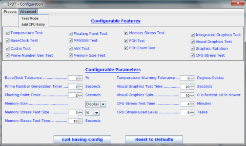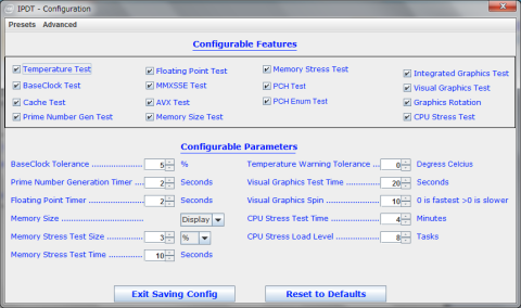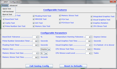 クイックテスト、フルファンクションテストと焼きこみ(?Burn-in)テストの3つのプリセットが選択可能で,それぞれテスト内容、レベルと時間が異なる。Burn-inの場合、CPUストレステスト時間が120分と長い。