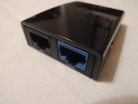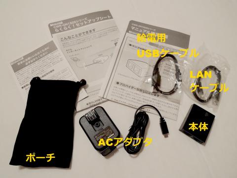 コンパクトな本体と、本体よりも大きなACアダプタ、LANケーブルと、USBケーブル、収納用のポーチが付属しています。