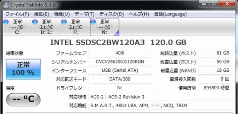CrystalDiskInfoで“カクうす9 SSD”の中身を確認してみると、驚くことにのintelの上位機種520シリーズのSSDなんですね。