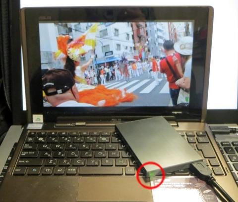 最後に ASUS TF101での接続なのですが、タブレットモード時には USB端子がないのでキーボードドックに接続した状態で繋げます。