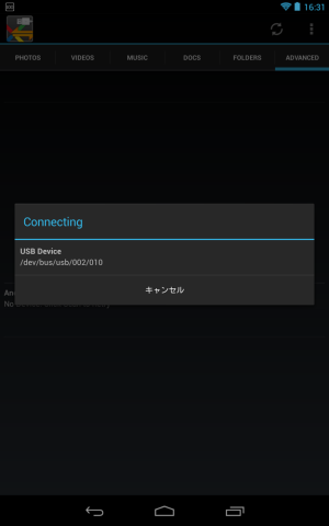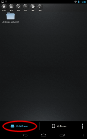 nexus 7から専用アプリの「WiDrawer」を起動して見てみると、USBデバイスが認識されています。