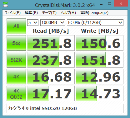 カクうす9 SSD 標準状態 (intel SSD520 120GB、intel Z77 USB3.0接続)