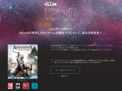 Ubisoft 30周年記念で6月から12月まで毎月1本PCゲームを無料配布しているキャンペーンで、