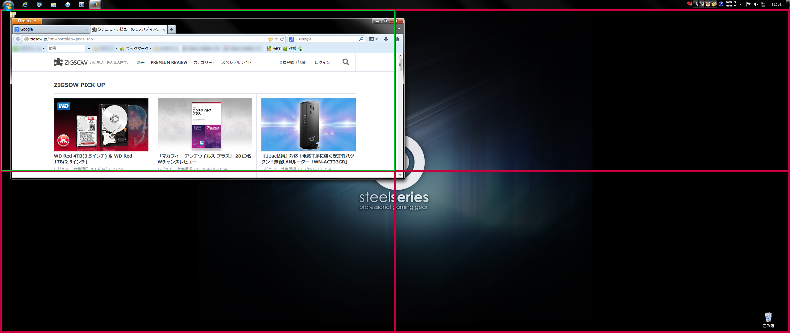 Windows7であれば、画面の隅までウィンドウをドラックするだけで、自動でリサイズしてくれる“スナップ機能”があるので、Screen Splitを使わなくても簡単に2画面分割が可能だ。