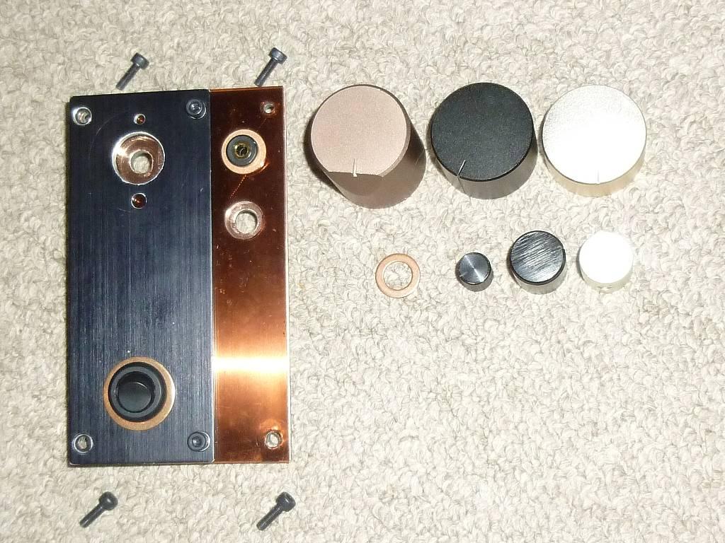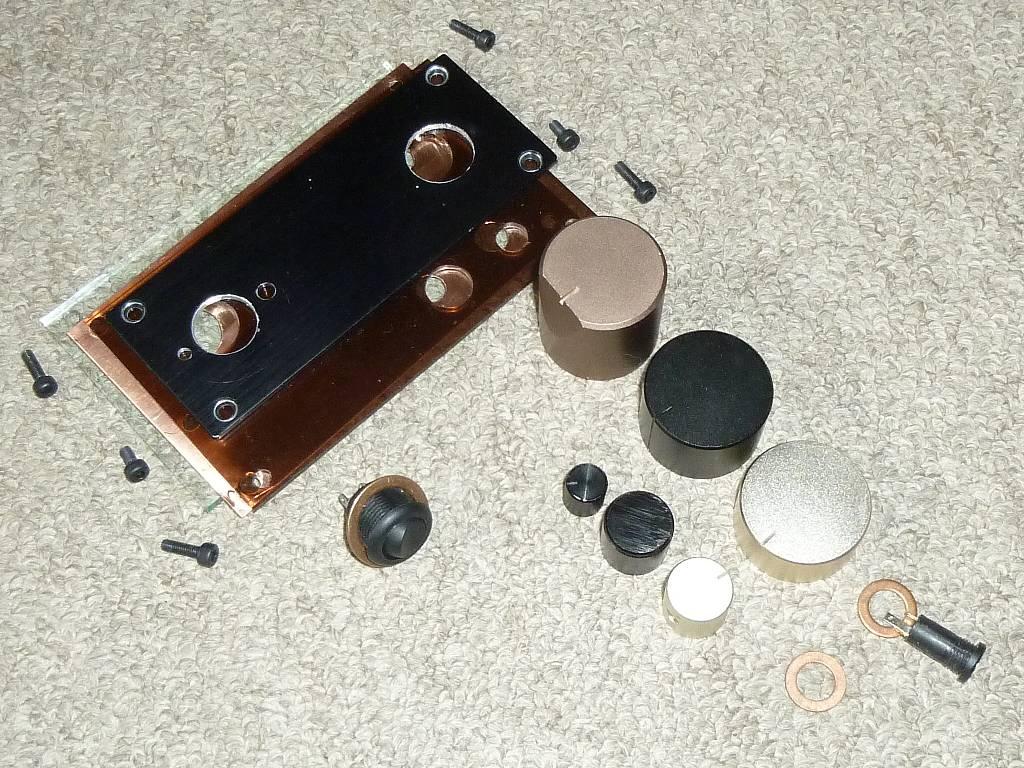 フロントパネルの加工済みパーツ、つまみ類の組合せ検討