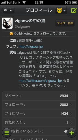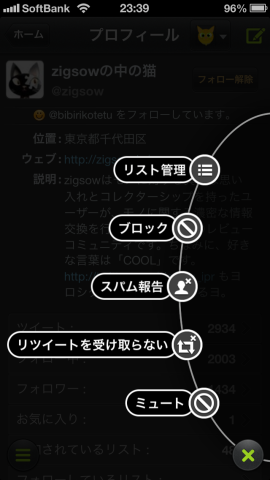 と、出るのでフォローするなどのTwitterで行う操作がそのままできます。