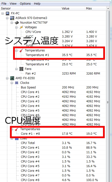 ぶっちゃけシステム温度と称しているほうはどこの温度をとっているのかさっぱりなのですが、念のため、ということで。