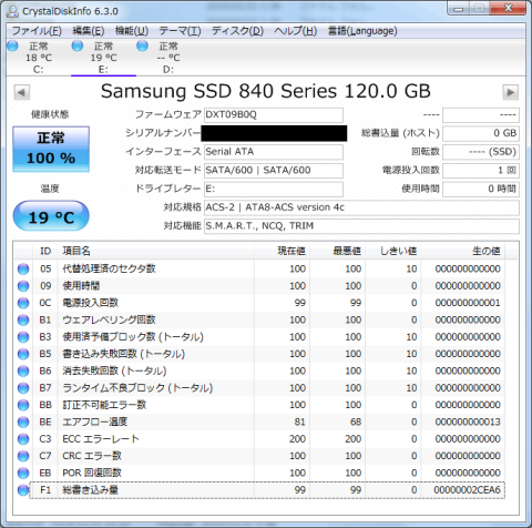 修理上がりといえど、CDIでは新品のような計測値。とはいえファーム更新でこの辺の値がリセットされるSSDもあったので(うろ覚えだが確かインテル)、これもリセットがかかっているだけだろう。