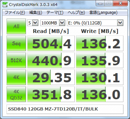 どうせ重要なPCに組み込む予定も無い。現状テスト用に組んだPCにOSを入れるとき、鈍足で古い320GBHDDを何度も何度も使いまわしていたのでそれの置き換えといった感じ。バラックで遊ぶ時もやはり衝撃に強いSSDは安心感がある。だからといってそれ専用に1万円クラスのSSDを出すほどでもないのでこの3000円840はピッタリだ。