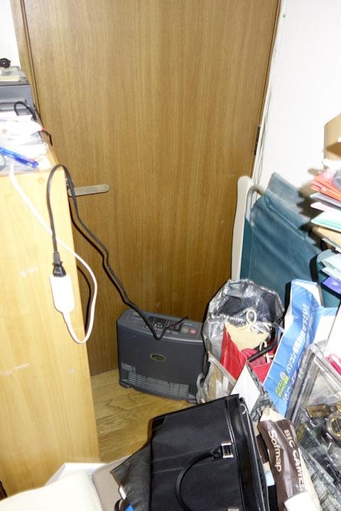見てお気づきでしょう.ヒーターがなくても開ききらない扉,ドアの右縁には大量のLANケーブル,枕元にも荷物が積んである(寝ている最中に降ってくることなんて普通).
