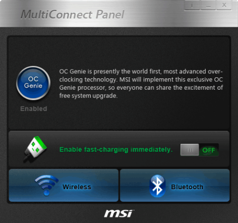 制御ソフトでは先述のOC Genie切り替えに加えて、SuperChargerのモニタリング、Wi-FiとBluetoothの設定が一括で確認できるようになっているが、それぞれの機能を一括で操作できるというだけで、ドライバ類は別途インストールが必要だし、このソフトをいれなくても動作はする。