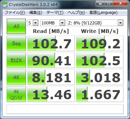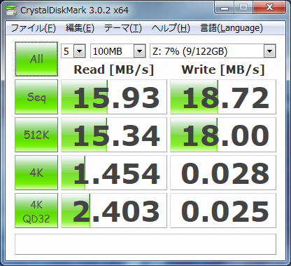 シーケンシャルだとRead:127.44Mbps、Write:149.76Mbpsのようです。