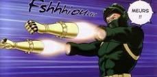 アニメ版第8話「激闘!コブラvsボーイ」での1シーン。クライマックスでボーイがゲルファイターで突撃してくるところを「そんな手」で迎え討つコブラです。