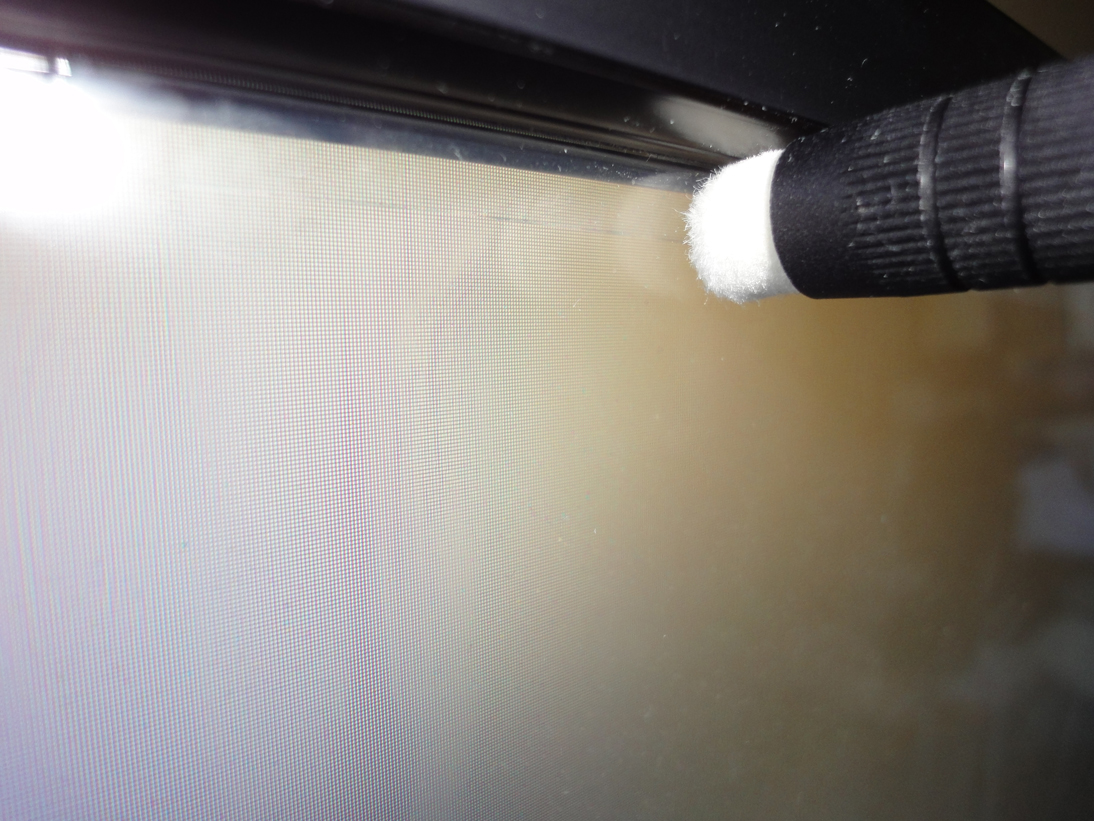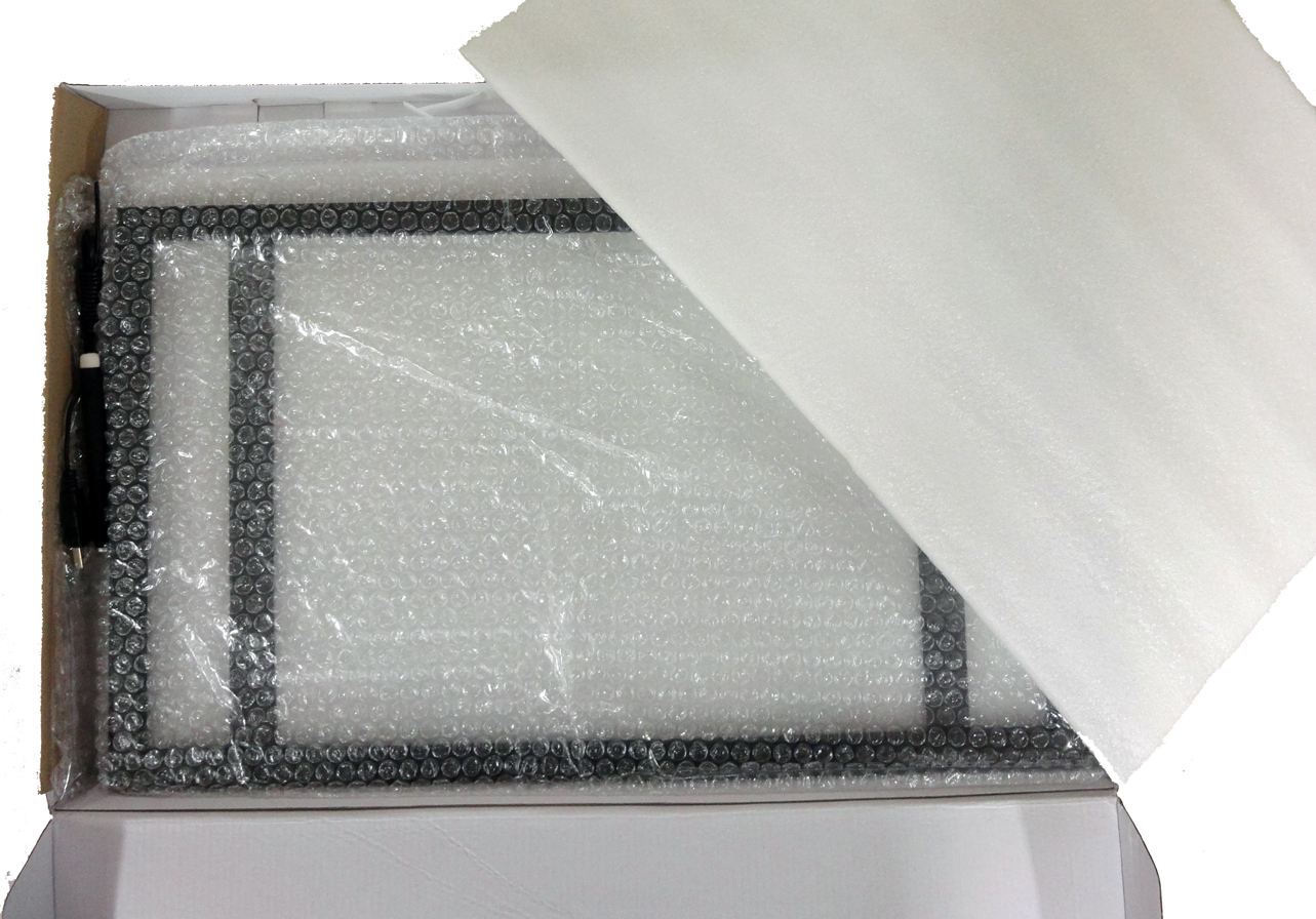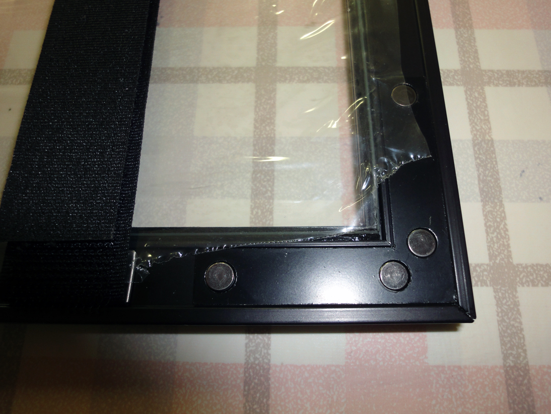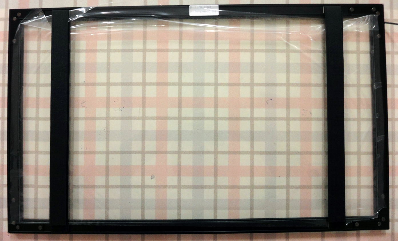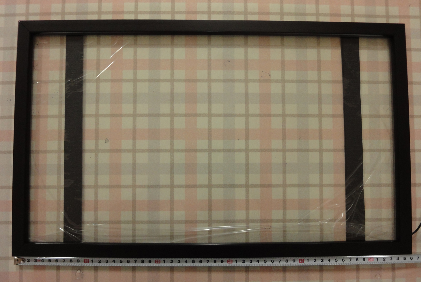タッチパネルの端の方にマジックテープがついているのですが、これを支点に吊す形になるので、液晶側のベセルがタッチパネル側のベゼルより狭いとパネルの位置を合わせることが出来ませんし、同じくらいだと緩み無くピンとマジックテープを張るのが大変です。