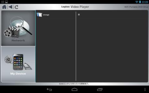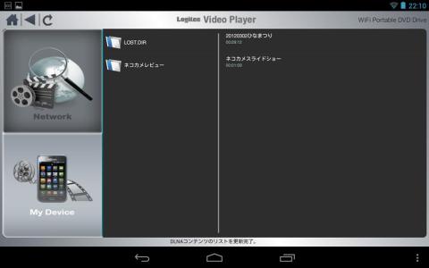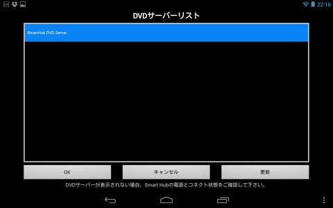 端末のメイン画面から「DVD Player」をタップすると「 DVDサーバーリストが表示されますが、最初サーバが見つからず「空」と表示されましたが、「更新」をタップすることによりサーバー名が表示され 1対1で接続している時と同等の操作が行えます。