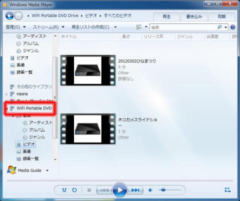 「WiFi Portable DVD Drive」をダブルクリックすると Windows Media Playerが起動し、USBメモリ内の再生できる音楽・動画・画像のファイルが表示されます。