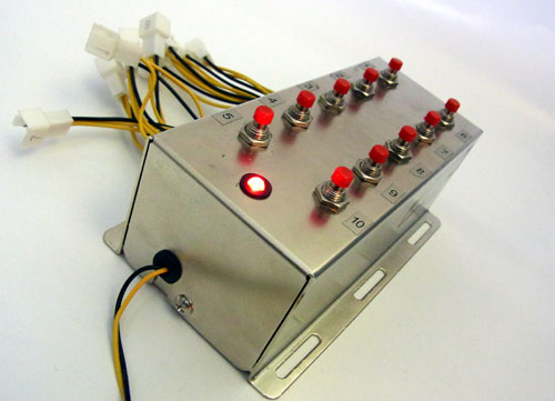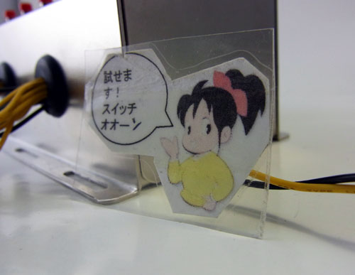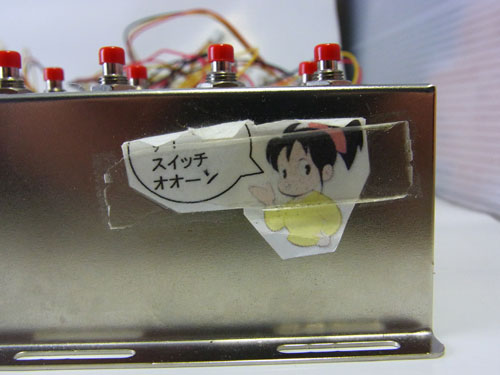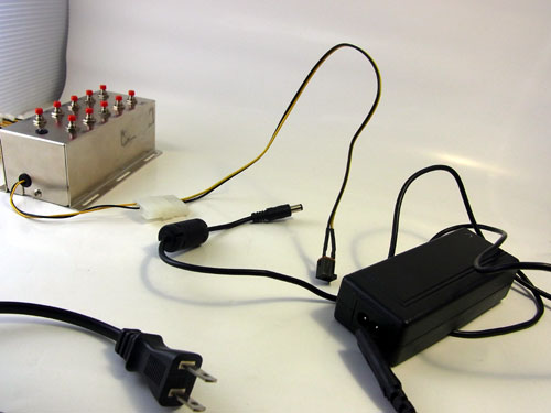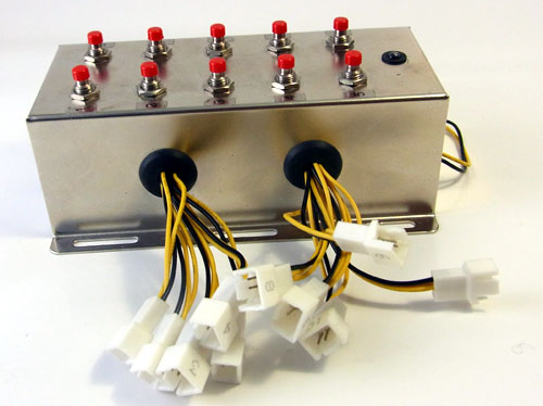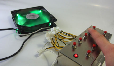 10個の押しボタンスイッチが整然と並んだ味気ない見た目に、大量に生えた3pinファンケーブル。そしてACアダプタ。側面に貼られたでん○ちゃんのセリフにその正体を垣間見る事ができる。