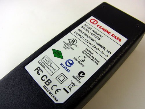そして電源コネクタ側は大4pinからACアダプタ用丸型コネクタに変換するケーブル、そしてそれにあったACアダプタと、メガネケーブルの3点セットが付属。コンセントから給電できるのでファンの展示の為にPCを使う必要も無い。