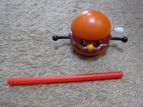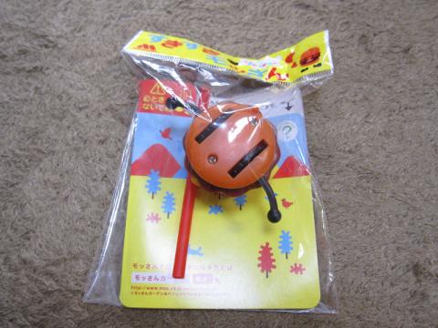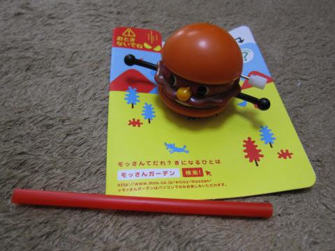 付属のストローを手に絡ませるとくるくる一か所で回り続けるおもちゃです。昔ファミコンでこういうゲームがあったような…w娘もモッさんの名前を憶えてきたようで、