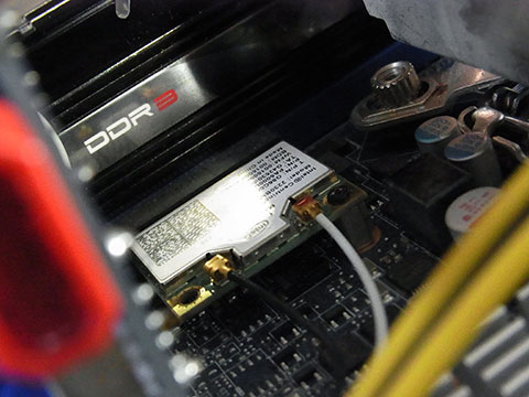 DH77DFのmini PCI-Expressスロットは、ハーフサイズ・フルサイズ両方に対応した固定ネジ穴が用意されているので、スペーサー等の追加はなしにそのまま挿してネジを1本締めるだけ。まあスサノヲが邪魔なせいで手持ちのドライバが入らず、電動ドライバのビットをラジオペンチで回すというムチャでしめるはめに。