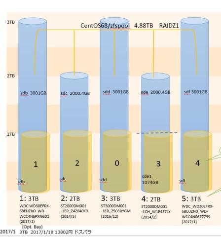 現在、5本のHDDで raidz (RAID5相当)を構成しています。