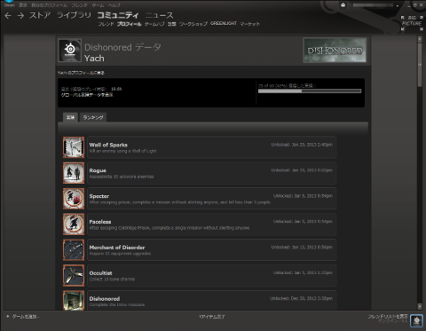 Steam Achievementsとは、ゲーム内で一定の条件を満たすとSteam上で称号が与えられるシステムだ。
