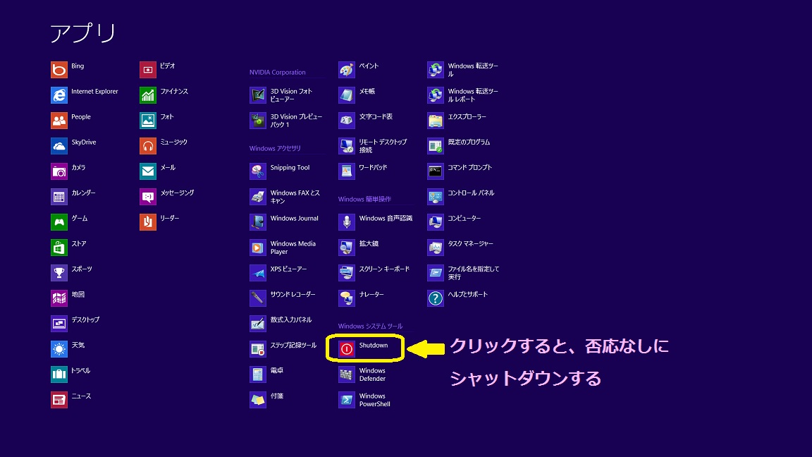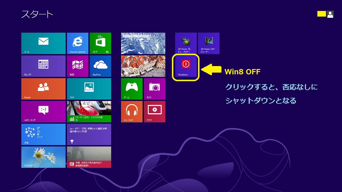 ※Windows8シリーズでは、スタートボタンがないので シャットダウンに戸惑いました。