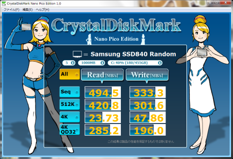 CrystalDiskMarkでは、ReadはIntel SSD 520とほぼ同じですが、WriteはSeqと512KでSamsung SSD 840が倍近く速いです。