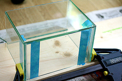 写真は端財のガラスを組んでオールガラス水槽をつくっているところ。