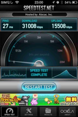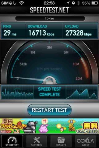 そこで有線LANポートにWN-TR2をつけて、iPhoneで速度計測してみました。