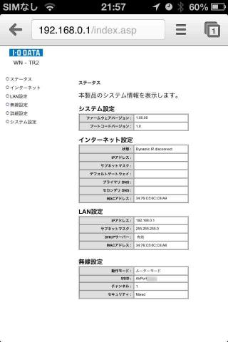 WN-TR2と接続すると、WN-TR2のIPアドレスは192.168.0.1になります。Webブラウザーで192.168.0.1に接続すると下のようなWeb設定画面が表示されます。こんな小さいのに据え置き型の無線ルーターのような細かな設定もできそうです。