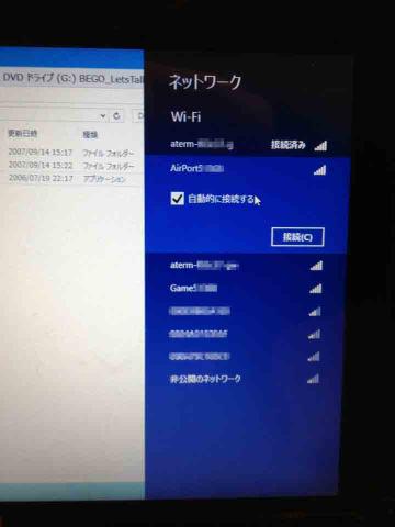 Windows8についてもWPAに対応しているので、Windows7と同様に簡単に設定できます。AirPortXXXXXが見つかったら、接続をクリックすると