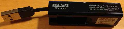 壁のコンセントに直指しのUSB ACアダプタから電源をとるためにWN-TR2は空中に浮いています。USBに接続するケーブルにストレスがかかりそうでケーブルの耐久性大丈夫かいな。I0データさんの製品だから当然十分な耐久性あると思うけどちょっぴり心配