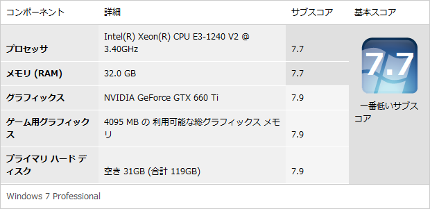 グラフィックに関しては、先代最上位のGTX580よりを大きく上回るだけあり、やはり7.9。エクスペリエンスのスコアはあまり参考にならないものの、カンストの数が多いとやはり気分的にもいいものです。