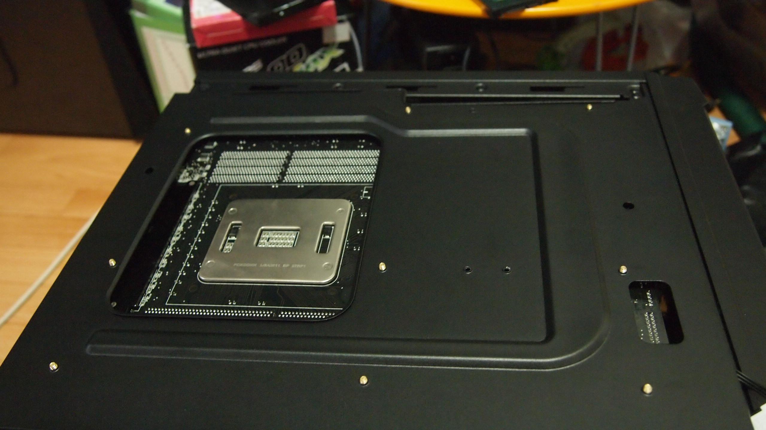 このキューブ二段構造になっており、マザーボードベースが取り外せるんですが、裏に穴が開いており、バックプレート交換も楽勝ですね。自分はLGA2011なんで使わないですけど