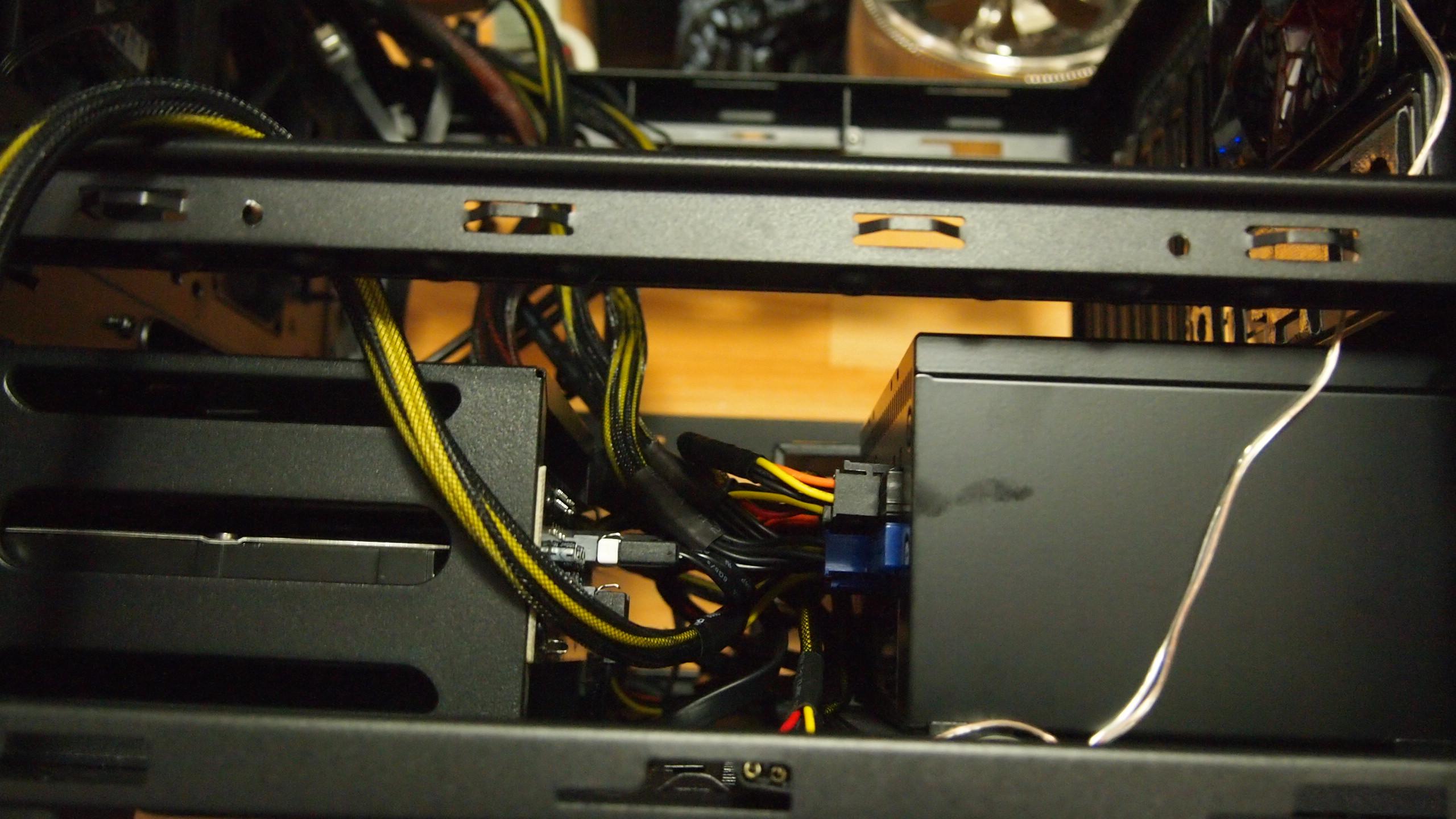 電源はホットスワップ基盤とかなり近く、右L字型のSATAケーブルを用意したほうがいいでしょう。