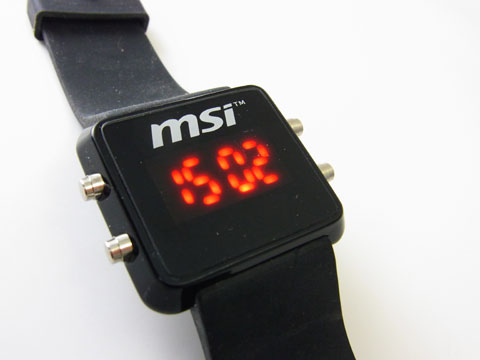 時計自体はごくごくシンプル。MSIのロゴが入り、下には赤の液晶画面。4桁の数字で時間・日付・年・秒を表示する。普段は液晶が消灯状態になっており、4つのボタンのどれかを押すと一定時間表示される仕組みなので、電池の消耗は少なそう。