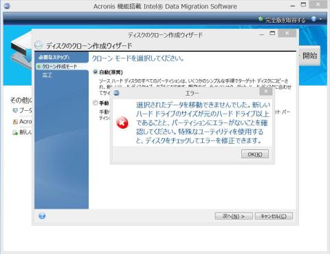 Acronis Intel Data Migration SoftwareはIntel製SSDが接続されてないと使えないのネ(ToT)