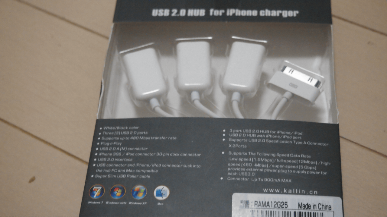 旧型のipad充電ケーブルとUSB3分岐。2Aとか流れてるポートならいいかも