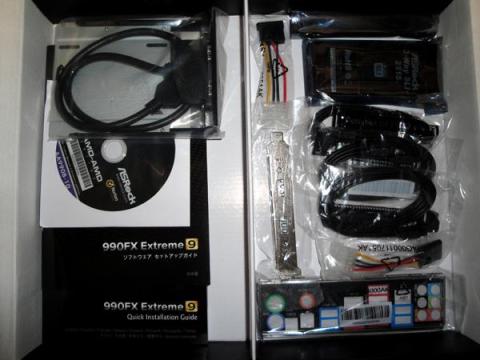 USB 3.0 のフロントパネル/リアパネル、インストールCD、マニュアル2冊、SATAケーブル6つ、 SATA⇒4pinコネクタを2つ、SLI Bridgeカードを2つ、I/Oパネルです。