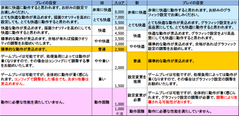 同一グラフィックボードでスコアが上がっている(GTX650 で旧Low:4,663に対して、新1280x720、最高画質:5,414)上に、評価基準スコアは下がっているので、新FFXIVの動作基準が低くなっていると考えられますね。