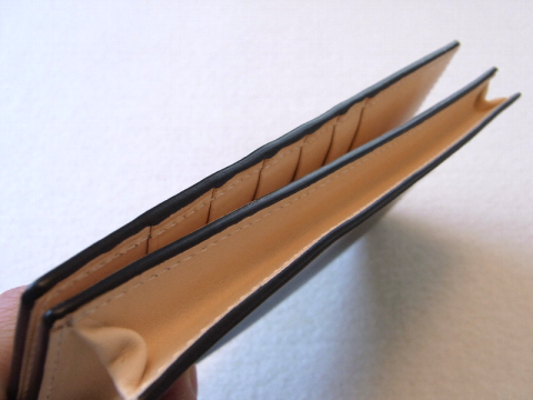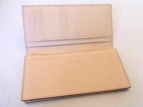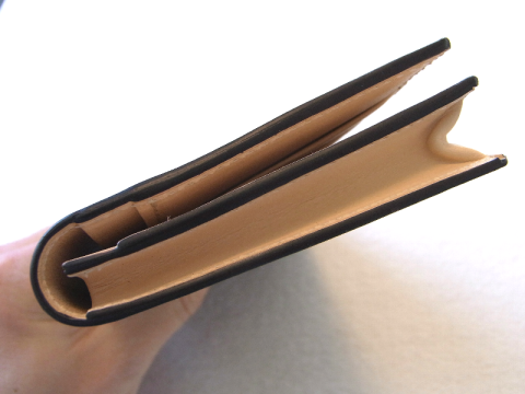 外装はコードバンの黒。内装はヌメ革の白。このギャップ感が面白い。