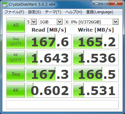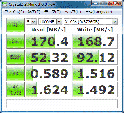 CrystalDiskMark 5.0.2はSSDに最適化されてるとか見た記憶があるのと以前と比較のためCrystalDiskMark 3.0.3です。