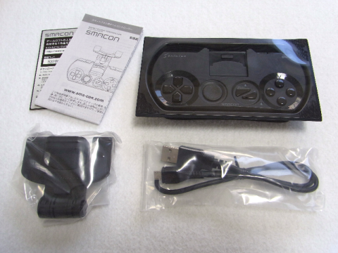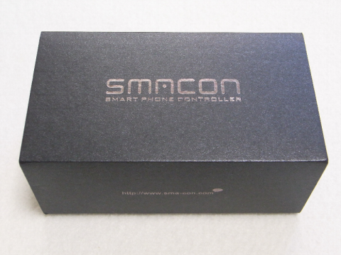 パッケージ内容は、スマコン本体、スマートフォン装着用クリップ、充電用USBケーブル、マニュアル。