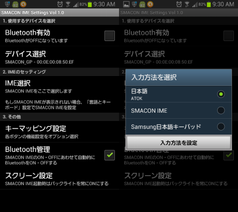 入力方式でSMACON IMEを選択すれば、自動的に端末側のBluetooth接続がONになり、SMACON IME以外を選択すれば、OFFになる。