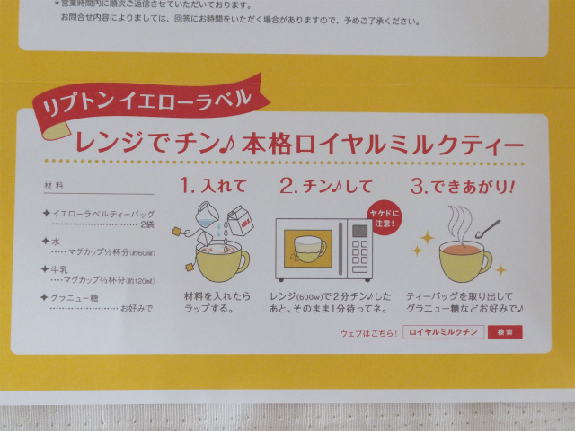 「リプトン ロイヤルミルクチンキャンペーン」に当選したので無料サンプルが送られてきました。